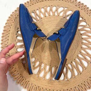 These are gently used TOD’S Women’s Kate Chain Loafer Mules Capri Blue Size EU 36.5. In good condition. Signs of wear throughout. Signs of wear at toes and along back near heels. Also, signs of wear on soles. See all pics for condition.