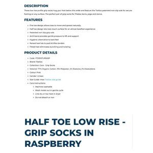 TOESOX NWT Size M (8.5-10.5) Raspberry Low Rise Half Toe Grip Pilates Yoga Socks