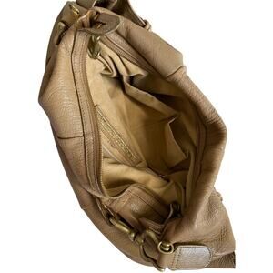 Vintage-style leather shoulder bag with brass hardware, slouchy silhouette, and double front pockets. 6" drop handle. Spacious interior.