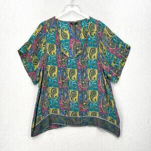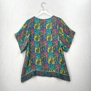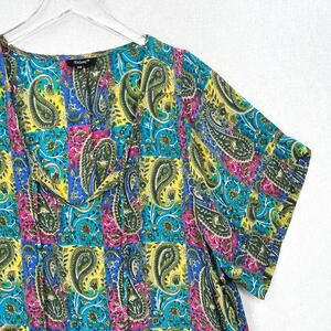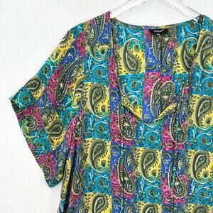 TOLANI Silk Tunic Top Womens XS Paisley Checker Print Tie V Neck Short Sleeve