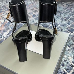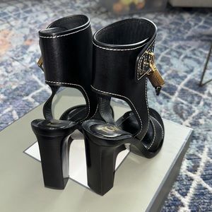 with contrast stitching. 4.1" block heel. Asymmetric toe strap. Ankle cuff secured by padlock. Cutout heel counter. Leather lining and sole. Made in Italy.