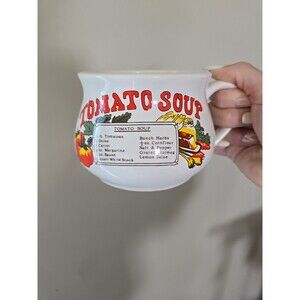 This vintage TOMATO SOUP Recipe Bowl Mug features a white color with a print on one side. The mug includes a handle for easy carrying and is made of ceramic material. Perfect for enjoying a bowl of tomato soup in style, this unique piece adds a touch of nostalgia to any kitchen or dining room.