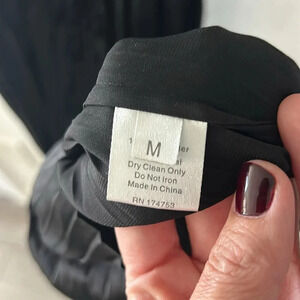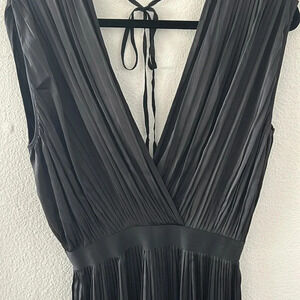 Black satin (100% Polyester). Hourglass. Short sleeves. V-neckline. Button with hook-and-eye closure. 46" from shoulder to hemline. Imported.