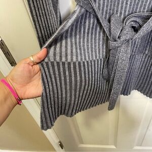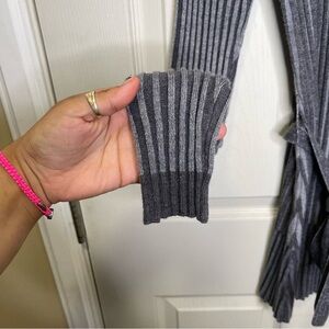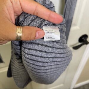 Grey rib knit (47% Acrylic, 27% Merino Wool, 26% Nylon). Sweater. Turtleneck. Long sleeves.