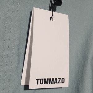 TOMMAZO Cyprus- Womens Artsy Designer Dress Size L - Long Bell Sleeve- Midi (49 in length) - Front slit - Stretchy - Raspberry - Almond blue (shadow blue) New with Tags