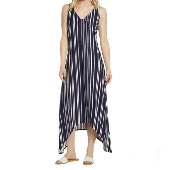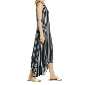 Long, vertical stripes cover this breezy sleeveless maxi styled with a dipped neckline and drapey asymmetrical hem.