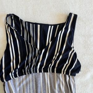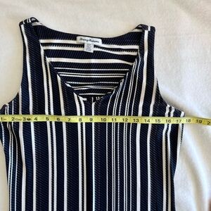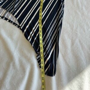 - Machine wash cold - Size S - length 57” longest, 47” shortest. Colors of navy blue, black and white. Gently worn few times, in great condition!