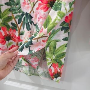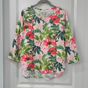 Embrace vibrant style with this floral print women's top. Boat neck style and 3/4 sleeves. Vented sides, slight high low hem. Featuring a lively mix of green leaves and pink flowers, this top is perfect for adding a fun splash of color to your wardrobe. It is also perfect for vacation or beach days. Good condition. Normal wear. Buttery soft cotton fabric.
