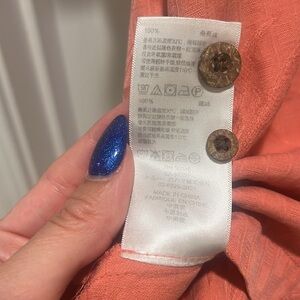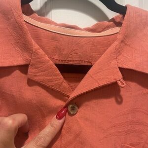 Questions? Leave a comment below! Color is a pinkish coral. Has subtle Hawaiian print. Lightweight, button down, collar, front pocket, 100% silk. Excellent condition. Retail $99. Size Medium.