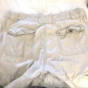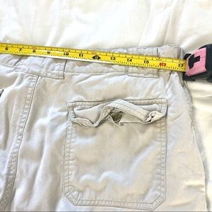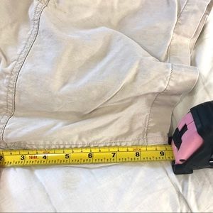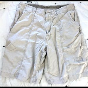 Preowned men’s beige colored Bermuda shorts with double front pockets on each side and flap pockets on the back. Hidden elastic waistband for a nice fit. Does have some dark spots on 1 front leg as in pictures only flaw these shorts have that I see.