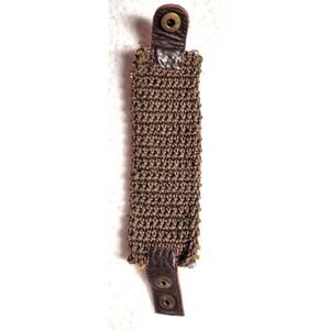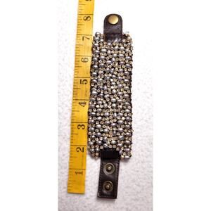 Bracelet features many gold prong set rhinestones and many faux? pearls sewn onto brown crocheted material with brown leather straps. Bracelet measures 8” in length and 2” in width. There are 2 snap closures so adjustable from approximately 6 3/4” to approximately 7 1/2” when wearing the bracelet. Overall length is 8”.