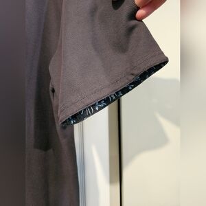 Contrasting garden print interior trim detail under the inside collar, the sleeve, and bottom hem.