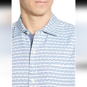Fine Tommy Bahama craftwork aligns the pattern perfectly when you button the shirt. Square hem with side vents so you can wear it untucked.