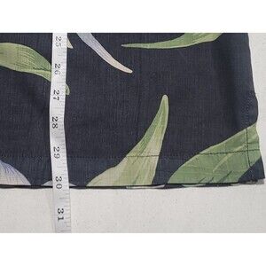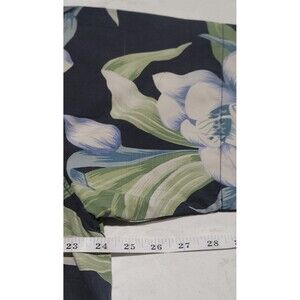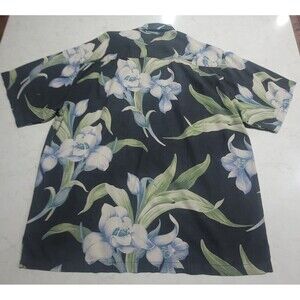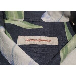 Elevate your wardrobe with this stunning TOMMY BAHAMA Hawaiian shirt. The shirt features a beautiful hibiscus pattern in charcoal blue and green, made from 100% silk with a relaxed fit. The button-up style includes a spread collar and short sleeves, making it perfect for any occasion, whether it be a party or a casual day out.