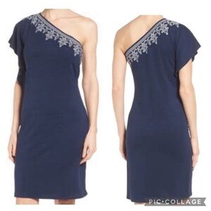 TOMMY BAHAMA Lovelin One-Shoulder Linen Blend Dress Embroidery Detail