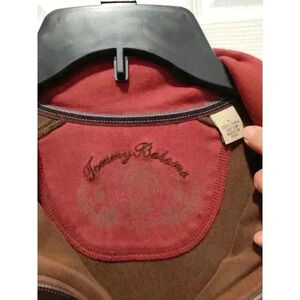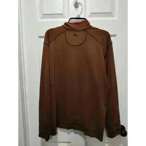 This TOMMY BAHAMA men's pullover sweater is a perfect addition to your wardrobe. Made of 100% Pima cotton, this sweater features a mock neck, long sleeves, and a 1/4 zipper. The brown color is perfect for the fall, winter, and spring seasons. The sweater is embroidered with the Tommy Bahama logo and has a relaxed fit. It is machine washable and made in Peru. The fabric type is jersey and it is a solid pattern sweater. The closure is a 1/4 zip and it is a size large.