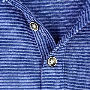* The shirt features a blue striped pattern that adds a touch of sophistication to the casual design.