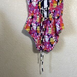 Reversible, bright and colorful women’s swimsuit with a vibrant floral design. And inside black and white stripes. Perfect for fun days at the pool or beach. No Size tag , but it’s 21 1/2” long from middle top to bottom