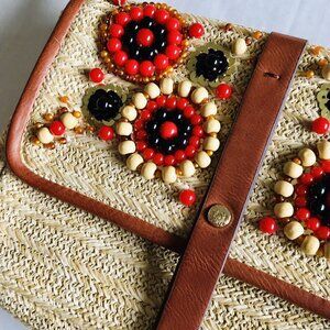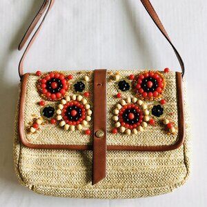 Bold, beaded trim accents this woven straw crossbody. Remove the adjustable faux-leather strap to quickly transform it form hands-free to evening-ready clutch in an instant.
