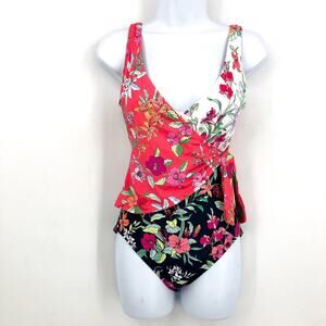 TOMMY BAHAMA Summer One-Piece Swimsuit Small Red Black Floral Wrap-Front NWT