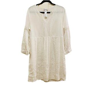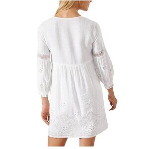 White Linen Blend Shift Mini Dress with Embroidery and Eyelet Fabric
