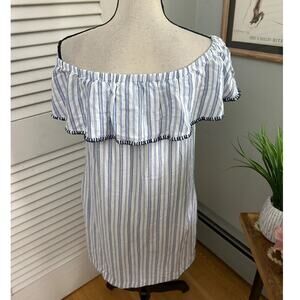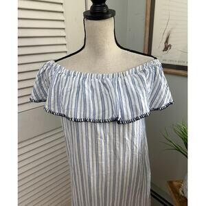 TOMMY BAHAMA Womens Dress Small Blue Ticking Stripe Off Shoulder Beach Summer