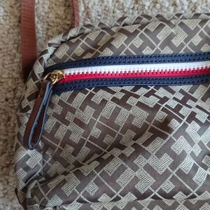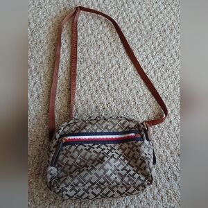 TOMMY HILFIGER BROWN SIGNATURE LOGO DOUBLE ZIP CROSSBODY BAG