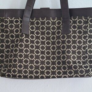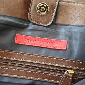 The Tommy Hilfiger Bag Purse in Tan Brown Brocade is a stylish and versatile handbag perfect for travel, casual outings, or business meetings. This small rectangular bag features a magnetic and snap closure, double brown handles, and gold-plated hardware accents. The exterior is made of faux leather and canvas with a brocade pattern, showcasing the iconic Tommy Hilfiger logo. The interior is lined with black fabric and includes inner and outer pockets for organization. This satchel/top handle bag exudes a preppy and timeless charm, making it a must-have accessory for any fashion-forward woman. Vintage, classic style. Size: 17 x 12 x 5