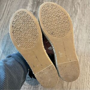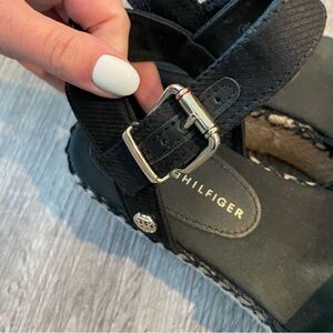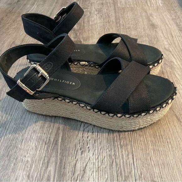 These Tommy Hilfiger sandals are in good used condition. Black canvas with espadrille platform. Some discoloration on the espadrille part from normal wear. No marked size, fit like an 8.5.