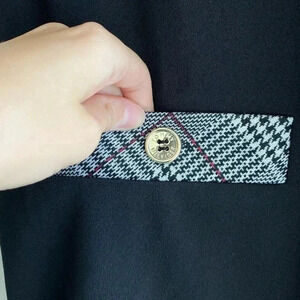 This Tommy Hilfiger dress is a true classic. The silhouette is a sheath dress with crewneck and short sleeves. The front features two small pockets at the bottom with red and white plaid trim and gold buttons. The back has an invisible zipper with the trademark TH gold logo zipper. The hem also has the white and red checked pattern trim. Great for business occasions, evening cocktails, or fancy holiday parties.