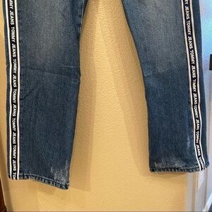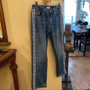 Pre-owned in great condition with stains. Women’s blue jeans with logo side bands and distressed/rips at the hem. No stretch. Comes from smoke and pet free home.