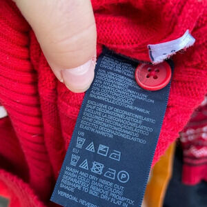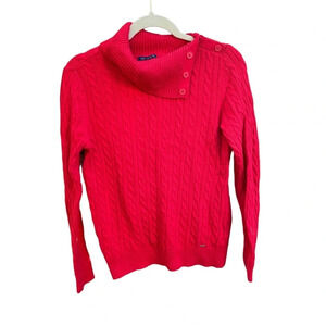 Pre owned. Excellent condition. I think it was washed once. Red cable knit sweater with button up turtle neck. WOMENS size large but I think it fits more like a medium. Perfect for the holidays and Valentine’s Day!