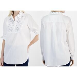 This Tommy Hilfiger Classic Cotton White 1/4 Button Closure Shirt in size XS is a versatile and timeless addition to any woman's wardrobe. Made from comfortable cotton fabric, this long sleeve shirt features a collared neckline and button closure for a classic look with an added rhinestone embellishment. The shirt is suitable for various occasions including travel, casual wear, workwear, and business meetings. With its solid white color and Tommy Hilfiger logo accent, this button-up shirt exudes a classic and elegant style that can be worn throughout the seasons. Easy to care for with machine washable instructions, this shirt is a must-have for any fashion-conscious woman.