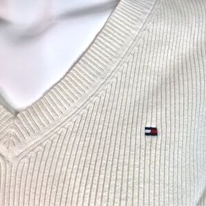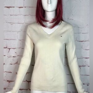 TOMMY HILFIGER Cream Ivory Ribbed Knit V-Neck Long Sleeve Top Size Medium