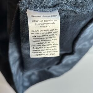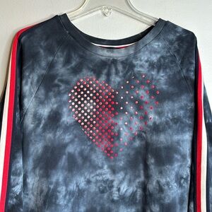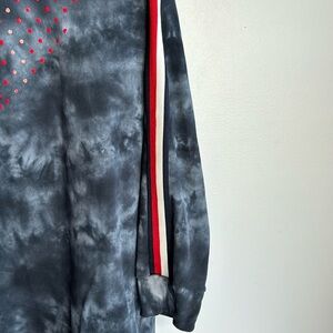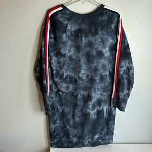 Armpit to armpit 23 1/2 inches length 37 inches. 100% cotton. Dark navy tie-dye sweatshirt dress. Has a band on the hem. Long sleeves with red white and navy stripes on each. On front has a heart design that is made of red polkadots. Excellent condition.
