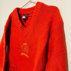 TOMMY HILFIGER Dark Orange Ribbed Knit V-Neck Logo Embroidered Sweater Size S