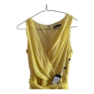 Faux wrap silhouette, midi length, surplice neckline, self-tie belt at the waist.