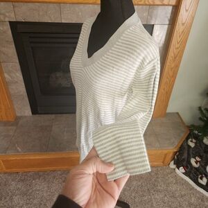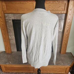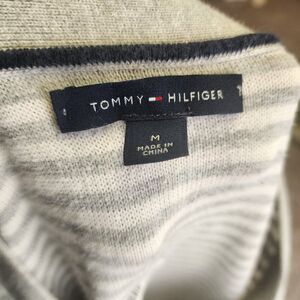 Today for your consideration is this beautiful light grey and white striped TOMMY HILFIGER sweater top which features a V-neckline, a split hem with a hi-low design, a loose or relaxed fit for comfort, a long sleeved style, and is crafted with a lightweight and soft 100% cotton. This sweater is pre-loved and in excellent condition.