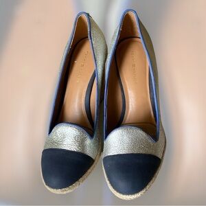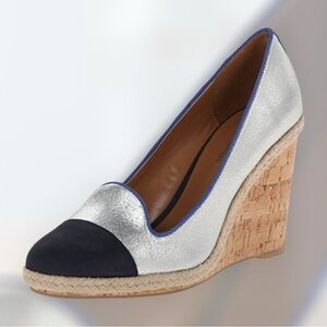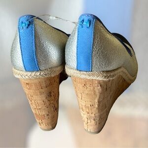 TOMMY HILFIGER JARDOT Jute Wrapped CORK 4” WEDGE PUMP Silver/ Blue Cap T…