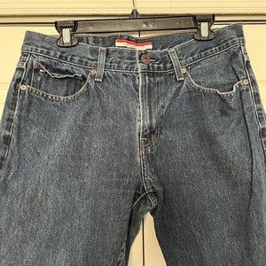 TOMMY HILFIGER Medium Wash Straight Denim Blue JEANS MEN'S 34x32 100% cotton Approx measurements laying flat waist 14" inseam 28" rise 10" machine washable