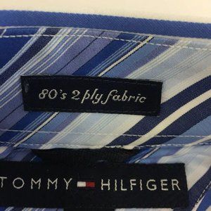 Classic Tommy Hilfiger men's Oxford casual shirt in size L. Blue and white striped design, made from 100% 2-ply cotton fabric. 80's vintage button front style with long sleeves.