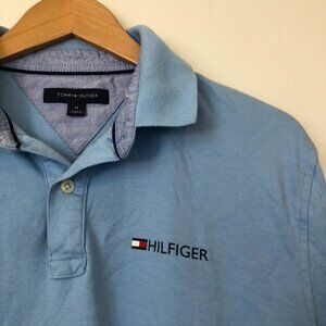 Solid light blue polo shirt. Short sleeve. Collared. Two button. Printed flag / "Hilfiger" spellout logo on chest. Side vents / slits. Seems to be Classic Fit, not 100% sure. Good condition overall - slightly fuzzy/pilly; small snag/pull near buttons