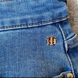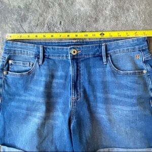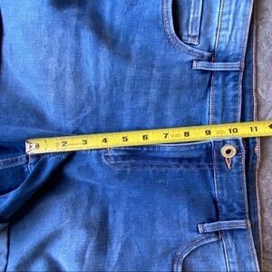 Super cute mid-rise blue jean shorts. Medium wash. Rolled cuffed hem....the hem does have a little stitch to keep the cuff in place that could be removed if you like a longer fit. Five pocket construction. Button and zipper closure. Factory fading and whiskering but no distressing.