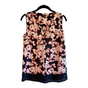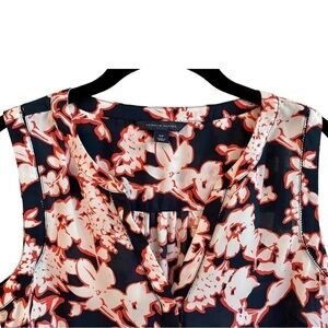 TOMMY HILFIGER, NWOT, WOMENS SLEEVELESS TOP IN NAVY, WHITE & RED. V-NECK WITH SNAP BUTTON PLACKET. PLEATED CENTER FRONT, SHEER NAVY BANDED BOTTOM, BACK GATHERED YOLK. SIZE S/P