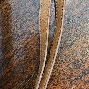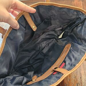 Brown faux leather trim on bottom, non-adjustable handles
