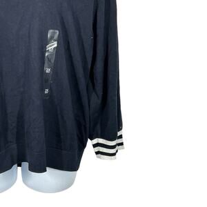 Tommy Hilfiger plus size sweater is new with tags! The 2X sweater has a roll-over ribbed panel across the chest, back, and arms. It has striped blue and white metallic sleeve cuffs and a solid navy blue body.