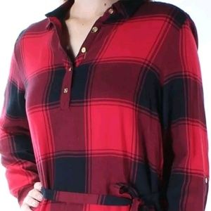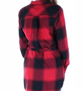 Beautiful Red Black Plaid Belted Long Sleeve Top 100% Cotton Casual