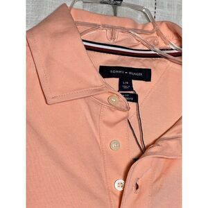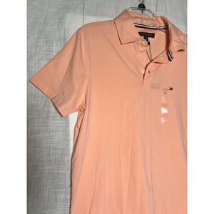 Elevate your wardrobe with this stylish and versatile TOMMY HILFIGER Slim Fit Essential Solid Stretch Polo in size L and beautiful Peach color. Crafted from high-quality cotton material, this button-up shirt is perfect for any casual occasion. The short sleeves and slim fit give it a modern and trendy look, while the solid pattern ensures versatility and ease of pairing with any outfit.