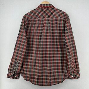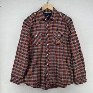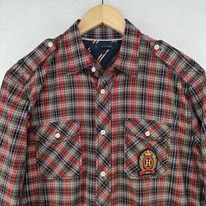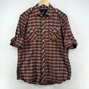 TOMMY HILFIGER Shirt Mens L Plaid Button Front Roll Tab Sleeve Crest Logo Red