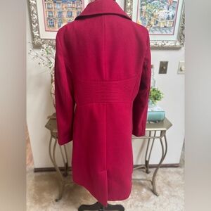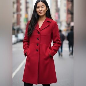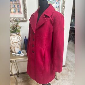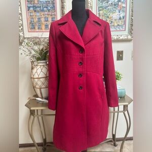 Beautiful deep red long coat with button closure. Tailored fit and elegant collar, nicely tailored & lined, pockets, kick pleat. A very heavyweight coat to keep you toasty warm. Great condition. Measurements 21” ptp, 37” length